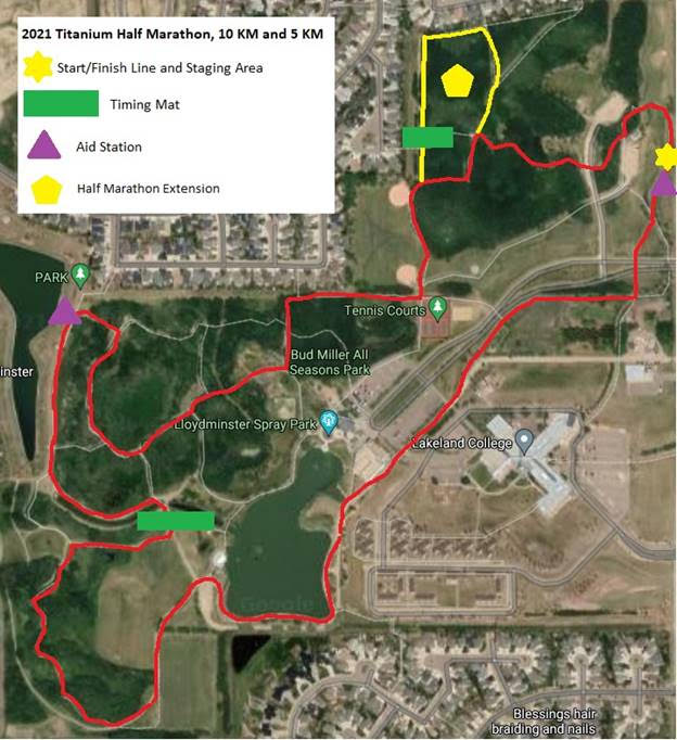 Our race course is a park trail based course in the beautiful Bud Miller All Seasons Park in Lloydminster, AB. The course is a 5 KM loop, with a 300 meter extension for half marathoners. The half marathoners will do the extended loop all 4 times. The course is approximately 50% asphalt bike path, 40% dirt and 10 % gravel. Also, there are a couple sharp corners. Course marking will be a mix of flags and signs.